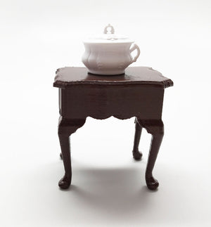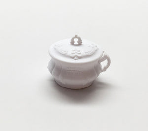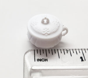 This decorative, plastic container with lid that comes off, can be used on a dresser to put jewels or one can put tiny sweets in it. About 3/4 inch wide and 3/4 inch tall.