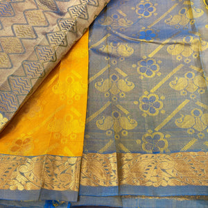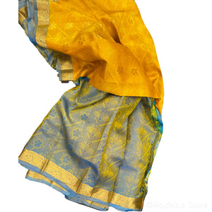 Stunning, Very high-quality saree. (With Real Gold Jari Threads. Amazing Radha Golden effulgent yellow and Krishna blue. Krishna Blue waves Design (Head Dress) Krishna Blue Chandrika and Flowers blouse (Choli Fabric) Medium weight and cooling silk, fabric. Good for weddings, festivals, or any special occasion.