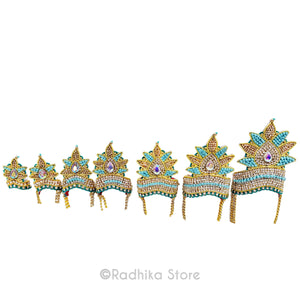 Handmade in Vrindavan. High-quality rhinestones and embroidery. Effulgent crown (Teal blue or Turquoise blue)