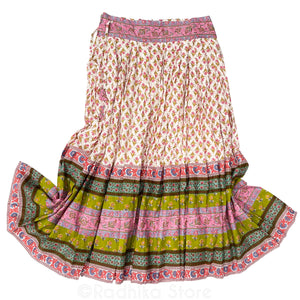 Made in Vrindavan Gopi Skirt 100% Cotton, 10 Meters of Fabric Lots of twirling capacity (good quality, medium weight fabric). Cream, Pink, Green, blue and lavender, screen print cotton fabric.. Fully lined wide border and built-in slip (Petticoat). Side zipper and adjustable drawstring on waist. ISKCON Style. Comes with long, cotton, Pink Chadar (Chuni) with border.