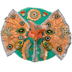 Handcrafted in the Holy Dham, Vrindavan, for your Laddu Gopal. Sea Green and Peach tool fabric. The tool is not soft, but frilly. The peach color fabric looks like his chadar (attached) Also comes with a jeweled chadar style necklace. His shirt is not attached, Put it on first then the skirt.