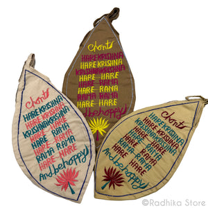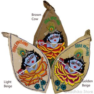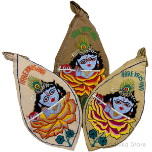 Embroidered, Good quality, Japa Bead bag, with Lord Krishna on a Flower On the reverse side is embroidered, Chant Hare Krishna Hare Krishna Krishna Krishna Hare Hare Hare Rama Hare Rama Rama Rama Hare Hare and be happy. With a zipper to keep your keys, Lakshmi (money) or any other small necessities, sacred items or prayers with you.