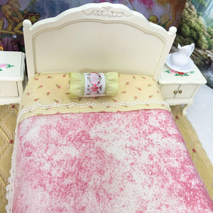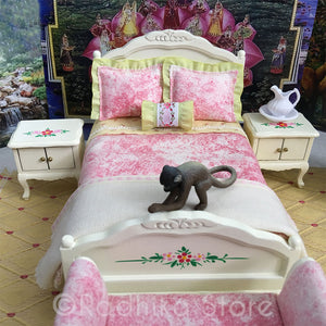 Our First bedroom set on Radhikastore. We reupholstered everything. Sweet design, with painted dot flowers on th furniture. and the pure cotton fabrics, is marble pink color. The mattress is 6 inches long by 4 1/2 inches wide and (The bed itself is about 6 3/4 inches long), the headboard is 5 inches tall. The nightstands are 2 inches by 1 1/2 by 2 1/2 inches tall. (The doors open). The Settee Seat is 4 inches long by 1 3/4 wide. The Vanity is 6 1/4 inches tall by 3 1/4 inches wide. (the drawers open).It comes with the yellow with pink roses mattress cover, sweet tiny flower top sheet, and two pillows double-sided comforter (bedspread), one round bolster pillow, a blanket, (which could be raw silk fabric, pure soft handloom fabric), two side tables, a vanity and vanity seat and a Sette chair. This set comes with the photo behind the bed with the lotus of Goloka Vrindavan. For those who like high quality, soft cotton raw silks fabrics. The rug, and all other items sold separately.