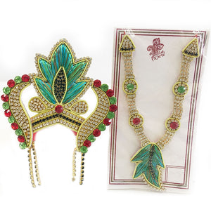 Stunning crown with leaf design with teals and greens and a touch of golden. Clear and black very good quality rhinestones with red and green glass crystals. The side panels are considered to be large earrings that are attached to the crown. Hand made in Vrindavan. High quality rhinestones and embroidery. (The rhinestone tassels can be removed if you prefer just cut them off and can be used as other jewelry. The crown has velcro strings in the back, so you can adjust the size.
