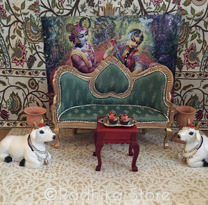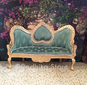 Divine Couple Golden throne. Earthy Green color soft satin fabric. Lots of Jewels.