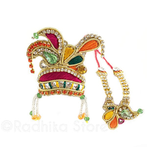 Festive, Orange, Yellow, Red and Green colors Kartik Festival Crown and Necklace Set. Hand made in Vrindavan. High quality rhinestones and embroidery. (The rhinestone tassels can be removed if you prefer just cut them off and can be used as other jewelry. The crown has velcro strings in the back, so you can adjust the size.