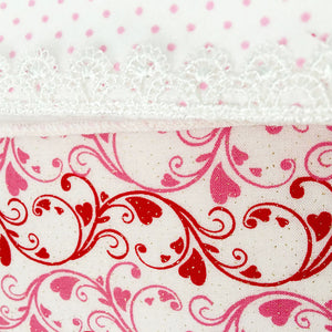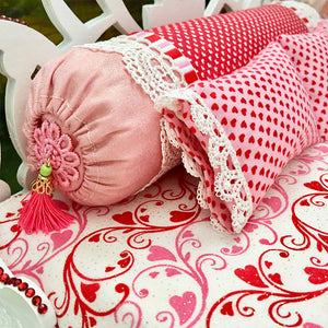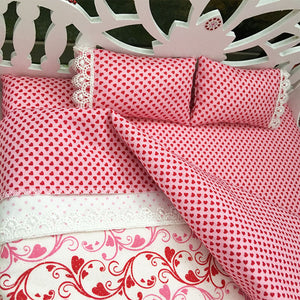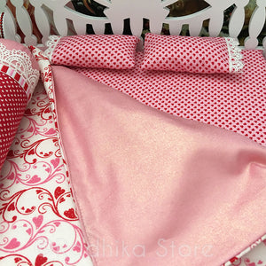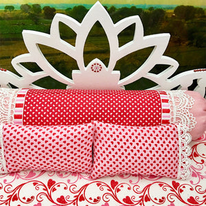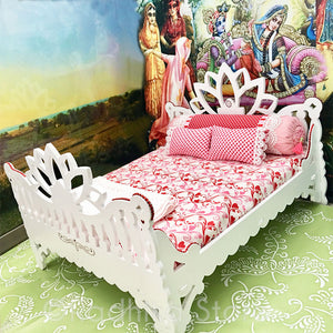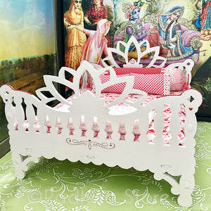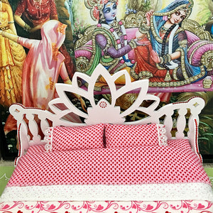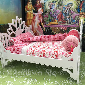 This bed is exclusively made for Radhikastore. We paint the bed, add jewels, make the pillows and the mattress and all the bedding. You can actually put your Deities in this bed (9", 10" 11" or 12" Deities). Strong well-made wood bed, with jewels). The nice mattress is 13 1/2" inches long by 12" inches wide. (The bed itself is 14 1/2 " long and 13 inches wide. The headboard is 10 inches tall and the footboard is 9" tall. It comes as seen in photos. For those who like high quality, soft cotton fabrics ... (colors of white, pinks, and red, hearts design) Two-sided cotton bedspread, (with sparkles on the heart fabric, that glisten at night), with a lace dust ruffle, cotton top sheet, fully covered cotton bottom sheet, cotton flannel blanket, two pillows and a bolster pillow. ( reverse side of the bedspread and bolster pillow are cotton with a fine gold thread to give it a polished opalescent sheen.)