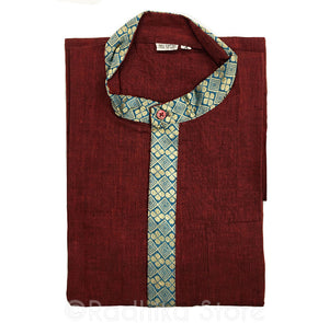Made in Vrindavan- High-Quality Natural Jute Fabric, (Feels like Cotton). Dark Maroon and a golden beige and teal blue trim on the collar, front and sleeves. Short Sleeve Kurta, (1/3 length). With front pocket and inner pockets (Hidden pockets) on each side.