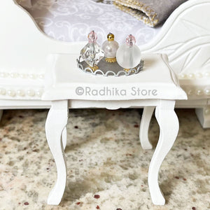 This Miniature Perfume tray is silver color. (not real silver) It is a mock up perfume tray. Not real perfume bottles, not real perfume. Comes with 3 bottles and a tray. (They do not come off)