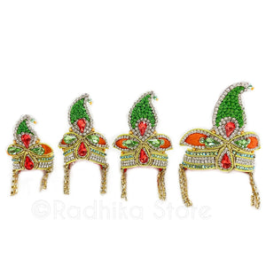 Beautiful Paisley (Chandrika ) design. Very good quality, auspicious colors of green and orange with white diamond color rhinestones and gold edging. (The rhinestone tassels can be removed if you prefer just cut them off and can be used as other jewelry. The crown has velcro strings in the back, so you can adjust the size.