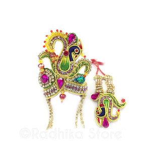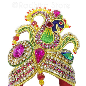 Very good quality, ruby rainbow burst, and white diamond color rhinestones, with Fuschia, green, yellow and red crystals and beautiful peacock embroidery. (The rhinestone tassels can be removed if you prefer just cut them off and can be used as other jewelry. The crown has velcro strings in the back, so you can adjust the size.