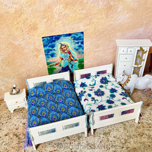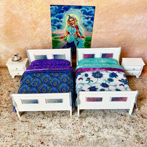 Choose Vrindavan Peacock Feather Deity Bed or Flowers in Yamuna Deity Bed. Painted milky white with lots of jewels. Comes with soft pure cotton sheets. Comes with sheeted mattress, (and attached pillow) top sheet, double bed cover. This is a delicate bed, not meant for heavy Deities. This bed can be for any of your Deities, Radha Krishna, Gaura Nitai, Krishna Balaram, Laddu Gopal, Srila Prabhupada, Srila Bhaktisiddhanta. The deities should have at least one inch space between the head board and foot board if you are placing them there.