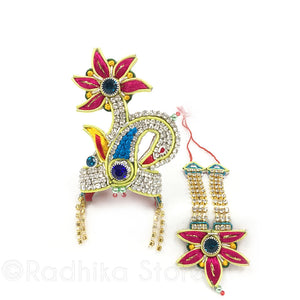 Made in Vrindavan. Very good quality, white diamond color rhinestones. Beautiful Red, Blue and yellow, colors, with blue crystals and lovely embroidery. (The rhinestone tassels can be removed if you prefer just cut them off and can be used as other jewelry. The crown has velcro strings in the back, so you can adjust the size.