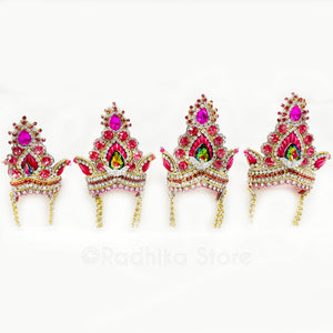 Note: If your Deities are very thin or have a extra tall base, you may want to downsize your crown one size.. Many Devotees like a little bit smaller crowns for Gaura Nitai. Devotees generally order one size smaller for Radha Rani, and sometimes even two sizes smaller. Generally smaller size crowns look better than oversized crowns.