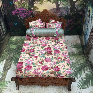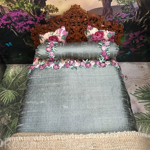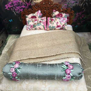 We LOVE this bed. Exquisite design, with intricate, carving Deity bed, fit for a queen. The mattress is 6 1/4 inches long by 43/4 inches wide and (The bed itself is about 6 3/4 inches long), the headboard is 4 3/4 inches tall. Made with excellent quality raw silk and pure cotton fabrics.It comes with the rose mattress cover and two pillows that came with the bed and it also comes with the items that we made- the top sheet, double-sided comforter (bedspread), one round bolster pillow, blanket, and the rug. As seen in the photo. For those who like high quality, soft cotton raw silks fabrics. The comforter is a handmade batik fabric and the reverse side is a raw silk.
