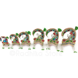 Made in Vrindavan. Silver color effulgent swan with colors of green, teal, purple and red. Very good quality, white diamond color rhinestones. With a green tassel. (The rhinestone tassels can be removed if you prefer just cut them off and can be used as other jewelry. The crown has velcro strings in the back, so you can adjust the size.