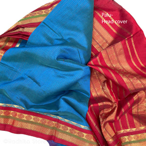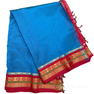 Stunning, Cotton/silk, high-quality saree. With Gold jaree. Soft and comfortable, Amazing blue with beautiful red with a small green strip in the border and gold Jaree. Bengali style. The colors and blends are a divine, first-class look, yet comfortable. Makes a great festival saree, wedding saree, or any special occasion.