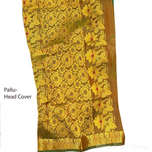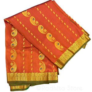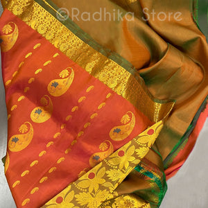 Gorgeous, pure silk, high-quality saree. With Gold jaree. Soft and comfortable, Rust or burnt orange with Gold undertones Shimer silk. The blouse fabric is a golden brown with a green opalescent hue. The colors and blends are a divine, first-class look, yet comfortable. Makes a great festival saree, wedding saree, or any special occasion.