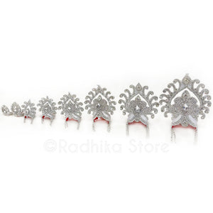 Note: If your Deities are very thin or have a extra tall base, you may want to downsize your crown one size.. Many Devotees like a little bit smaller crowns for Gaura Nitai. Devotees generally order one size smaller for Radha Rani, and sometimes even two sizes smaller. Generally smaller size crowns look better than oversized crowns.