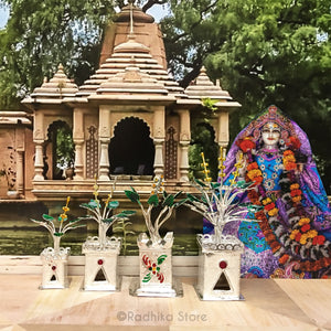 This Miniature, Silver Tulsi plants are made in Vrindavan. The Leaves and Manjarres painted with Lacquer a common use for Jewelry and miniatures in India.