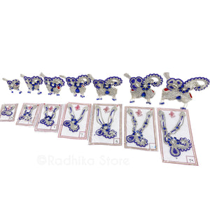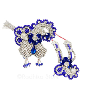 Hand-made in Vrindavan. Beautiful Sapphire blue colors. (Balaram Blue) Lord Balaram Becomes all the Paraphernalia of the Supreme Lord Sri Krishna! Even HIs Crowns. High-quality rhinestones  (The rhinestone tassels can be removed if you prefer, just cut them off and it can be used as other jewelry. The crown has velcro strings in the back, so you can adjust the size.  The Necklace can be turned upside down and used for a crown and tika for Srimati Radharani. Use Tickey Tack to secure.