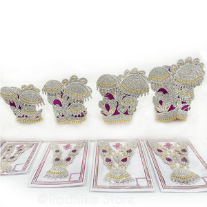 Details- Silver with Accent Gold and Dark Purple. It may also work with Maroon outfits. This Crown is very Tall. It is deisgned that way to look like Umbrellas hanging over Their Lordships. This crown would also be amazing on Lord Jagannath Baladeva. This crown could also be used as a decoration on the altar and it can also be opened up for some decoration. The necklace can also be used as a belt or Turban piece.