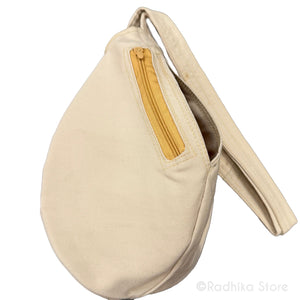Exclusive, hand-painted, by Brajabasi artist in Vrindavan. Thick Cotton cloth, bead bag. A beautiful work of art. -These bags have a shimmer glitter paint.
