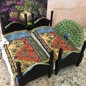 Darling black painted wooden bed set, (two single beds), very well made. With multicolored crystal jewels along the headboards and foot boards. The bed came with milky white pinstripe cotton sheet, with attached pillow. Cotton quilted style bed covers. With cotton flannel blankets and dust ruffle trims.