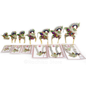 Note: If your Deities are very thin or have a extra tall base, you may want to downsize your crown one size.. Many Devotees like a little bit smaller crowns for Gaura Nitai. Devotees generally order one size smaller for Radha Rani, and sometimes even two sizes smaller. Generally smaller size crowns look better than oversized crowns.