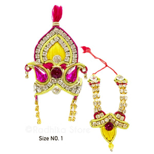 Note: If your Deities are very thin or have a extra tall base, you may want to downsize your crown one size.. Many Devotees like a little bit smaller crowns for Gaura Nitai. Devotees generally order one size smaller for Radha Rani, and sometimes even two sizes smaller. Generally smaller size crowns look better than oversized crowns.