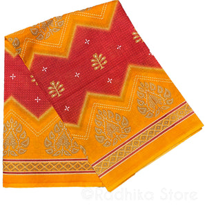Soft and comfortable, 100% Cotton Printed Saree, for everyday use. Very festive colors Marigold and Reddish Orange, Gold and Burgundy). Perfect for temple wear or festivals. 5.5 meters