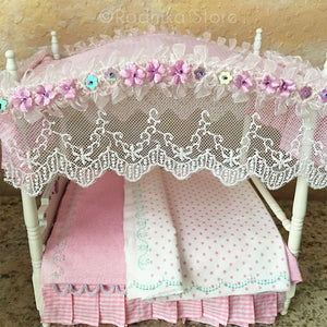 Beautiful Wooden painted creamy white, queen size canopy Deity bed. Comes as seen in photos. For those who like high quality, soft cotton fabrics ... Two sided cotton bed spread, pink cotton sheets, embroidered, cotton, teal blue blanket, an extra winter, cotton pink polka dot blanket, dust ruffle, and two head pillows (double sided).