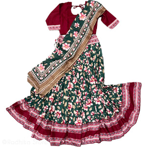 Made in Vrindavan Gopi Skirt 100% Cotton, 7 Meters of Fabric Good twirling capacity (good quality, medium weight fabric). Forest green with pink and cranberry colors and cream, with golden beige on screen print cotton fabric.. Fully lined, wide border and built-in slip (Petticoat). Side zipper and adjustable drawstring on waist. ISKCON Style. Comes with long, cotton, Pink Chadar (Chuni) with blue border.
