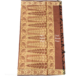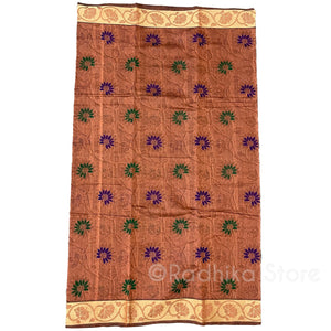 Cotton/ with a touch of silk, high-quality saree. Soft and comfortable. Rust, earth colors with deep purple and green, with a soft golden sand color border. Good for everyday use or any occasion.
