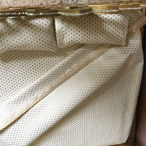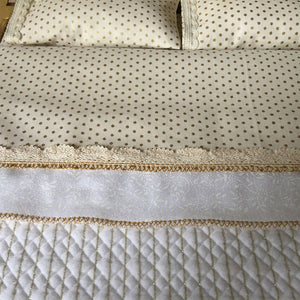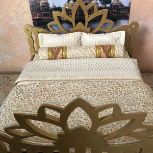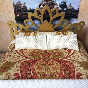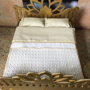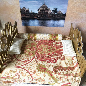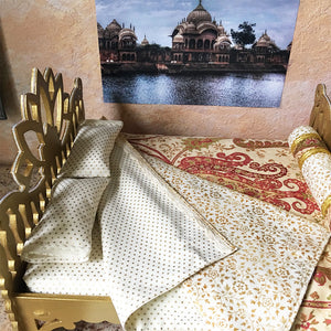 This Wood bed is exclusively made for Radhikastore. We paint the bed, add jewels, make the pillows and the mattress and all the bedding. You can actually put your Deities in this bed (9", 10" 11" or 12" Deities). Strong well-made wood bed, with jewels). The nice,firm mattress with a nice white cotton fabric, is 13 1/2" inches long by 12" inches wide. (The bed itself is 14 1/2 " long and 13 inches wide. The headboard is 10 inches tall and the footboard is 9" tall. It comes as seen in photos. For those who like very high quality, soft cotton fabrics ... (Creamy Dreamy sheets with Gold polka dots) ; double-sided cotton top sheet with cotton lace trim, fully covered cotton bottom sheet, cotton Two pillows and a bolster pillow with gold trim. Warm cotton Blanket, two-sided cotton bedspread (earthen colors, Reverse side, cotton cream, and gold flowers).