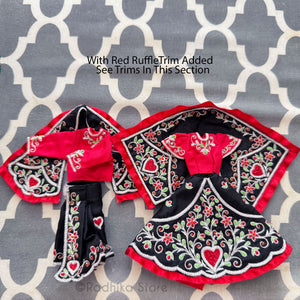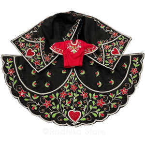 Hand-made in Vrindavan by ISKCON Devotees. Best quality. Detailed, first class embroidery. Lovely outfit! Soft, pure silk including silk lining! All sewn, not cut edges. No strings to cut. Beautiful outfit. Not stiff. Nice shirt design. Nicely fitted Choli. Black Dhoti and chadar with Red Shirts (Kurta and Choli), all Silk fabric. Silver lime green with Silver Jari Vines embroidery, with red sparkling seed beads. Wrap style dhoti with Velcro to adjust. Wrap Gopi Skirt that ties in back. (You can also pin it)