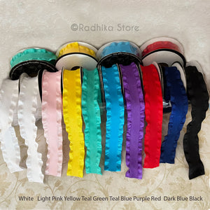 Embellishment Ruffles are intended to glue or sew on to your Deity outfits to enhance their beauty or to lengthen a skirt or dhoti. Also if you have a Dupata (chuni or head cover) for Srimati Radian that needs extending, they also work nicely for that. (See photo examples)