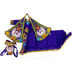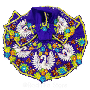 Stunning, sparkling like anything! Best Temple Quality Outfit. Evening Radha Kund Deep Purple Silk with Cotton Lining. Radha Krishna Deity outfit. Beautiful bright yellow Sequin all around. with lots of sparkling embroidery, with red and yellow jeweled flowers, and clear crystal rhinestones.. White swans with a little pink seed beads. Orange, teal, yellow flowers, with bright green leaves.This outfit comes with a beautiful belt for Krishna. Tie it in back.