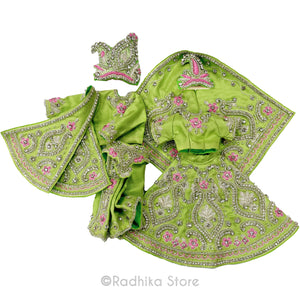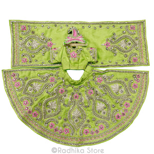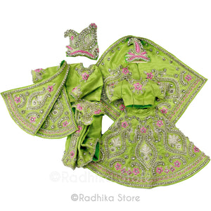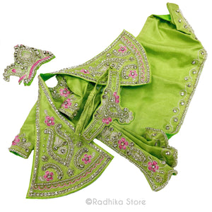 Perfect for almost any festival. Beautiful, Light, yet bright, Vrindavan parrot green, soft silk, with cotton lining. Not stiff. High-quality detailed, intricate, embroidery with lots of glistening silver jari, tiny silver glass beads and rhinestones with a lovely pink embroidery also.
