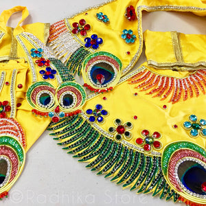 Measure Sri Sri Gaura Nitai from the waist to top of His lotus feet, with an inch ruler or tape measure. Or measure with a string then measure the length of the string.) The dhoti length in the Size section shows how long the front section hangs. That will determine the size you need. (For example, if your measurement is 4" inches from waist to top of Their Lotus Feet, then you need the 4" inches dhoti size) Choose the length that is that size.