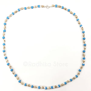 Hand Crafted in Vrindavan. This fancy Silver Tulsi necklace, is 24 inch, end to end, with Turquoise beads and sterling silver end caps and clasp. High quality, Handcrafted in Vrindavan. Each and every one of these necklaces is a work of art. They will vary slightly in size, color, and design. Note according to or Vender in Vrindavan they are real Turquoise beads.