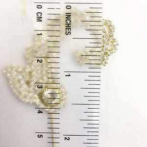 Gold color with good quality, clear, diamond color rhinestones. Flat back.