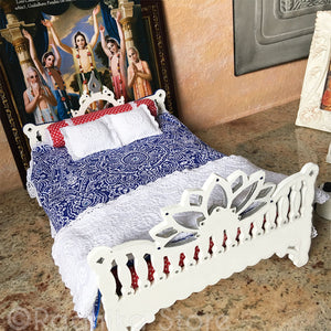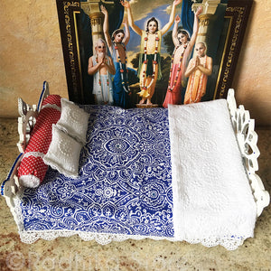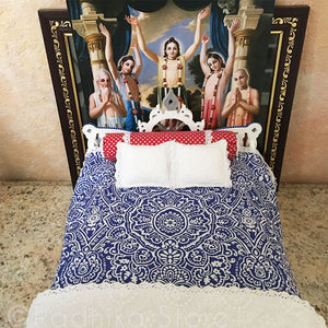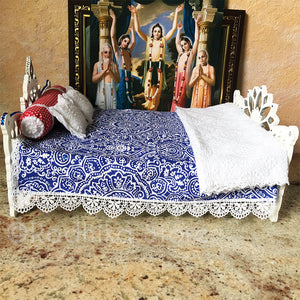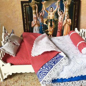 This bed is exclusively made for Radhikastore. We painted the bed, (Milky white, with silver color) and added deep blue and clear faux crystal jewels) We made the pillows, the mattress, and all the bedding. You can actually put your Deities in this bed (9", 10" 11" Deities). Strong well-made wood bed). The nice mattress is 12 1/2" inches long by 7 1/2" inches wide. (The bed itself is 13 " long by 9" inches wide. The chakra headboard is 7" inches tall at the highest point, and the lotus footboard is 6" tall. It comes as seen in photos. For those who like high quality, soft cotton fabrics ... (Primary color Red and Blue with White) Two-sided cotton bedspread, with a double sided cotton top sheet, fully covered cotton bottom sheet, white, cotton embroidered blanket, two pillows, and a bolster pillow. Blue and white crystals. Cream colored paint, with silver color, accented paint.