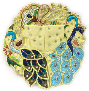 Handcrafted embroidery in the Holy Dham Vrindavan and would look gorgeous on your Laddu Gopal! Cotton mix peacock dress. Very Exclusive Design. High-quality rhinestones and other stones. With real peacock feathers on the Left.