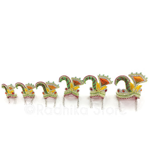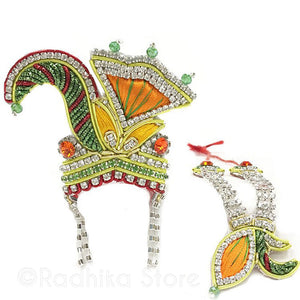 Made in Vrindavan. Very good quality, green and white diamond color rhinestones. Auspicious colors, orange, green, and yellow, colors, with orange crystals and beautiful embroidery. (The rhinestone tassels can be removed if you prefer just cut them off and can be used as other jewelry. The crown has velcro strings in the back, so you can adjust the size.