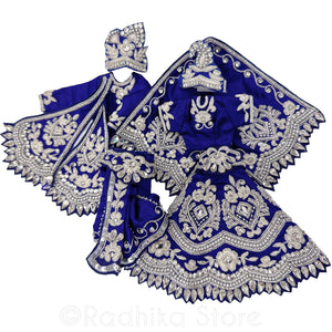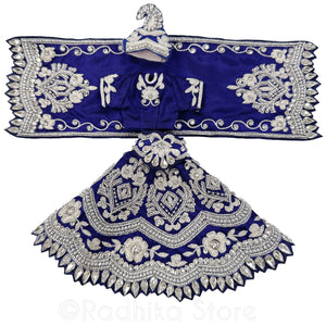 Great for Janmastami or Kartik Month. Temple quality. Stunning Deep Indigo Blue/Purple Silk, with cotton lining. Not stiff. High-quality detailed, intricate, Silver Jari embroideryTurquoise and, Silver seed beads and sequin and lots of diamond crystal rhinestones.