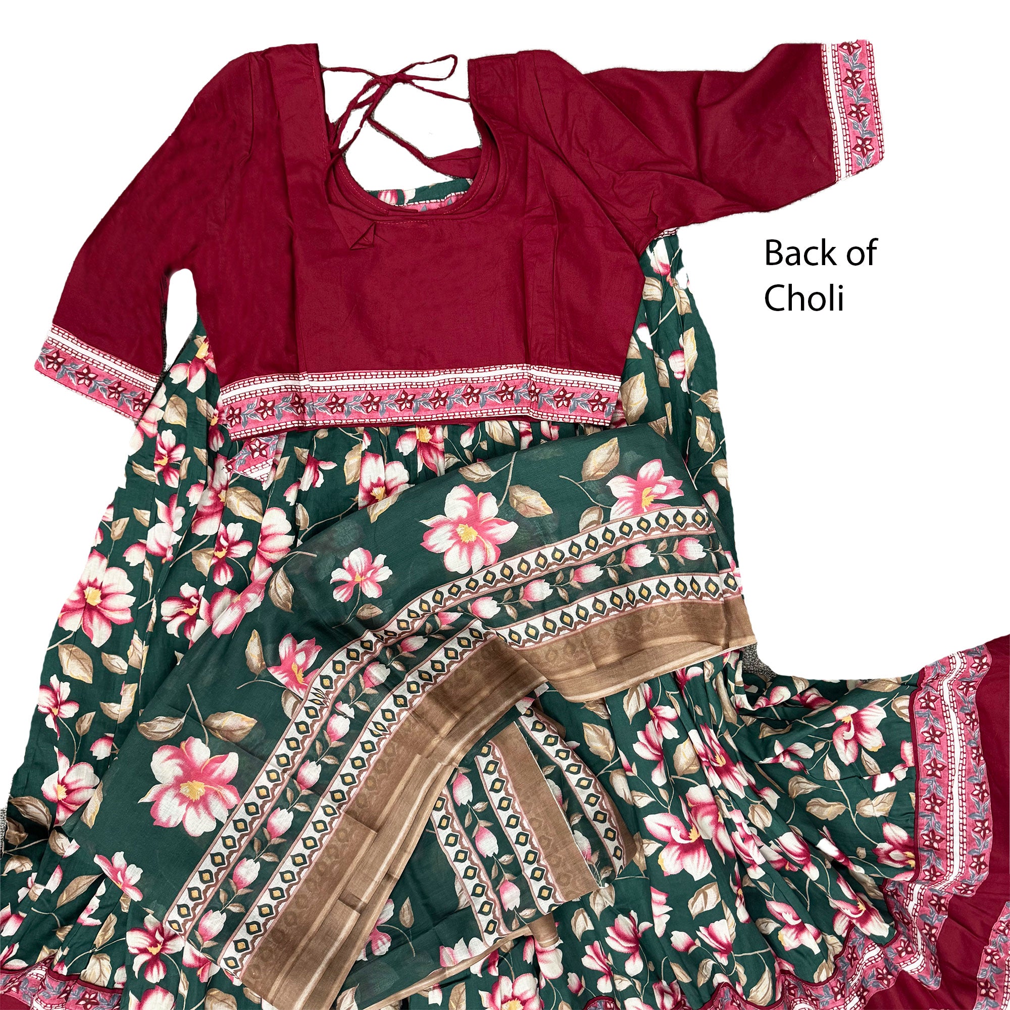 Made in Vrindavan Gopi Skirt 100% Cotton, 7 Meters of Fabric Good twirling capacity (good quality, medium weight fabric). Forest green with pink and cranberry colors and cream, with golden beige on screen print cotton fabric.. Fully lined, wide border and built-in slip (Petticoat). Side zipper and adjustable drawstring on waist. ISKCON Style. Comes with long, cotton, Pink Chadar (Chuni) with blue border.