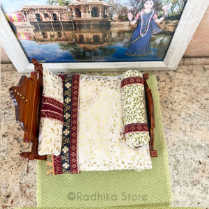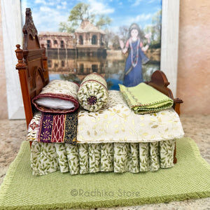 In the temples, generally, they offer a bed to the Lord by meditation. Mentally you place them in the bed and say prayers. This bed can be for any size Deities if you put Their Lordships to rest by meditation.