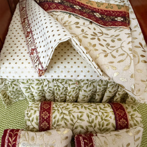 It comes as seen in photos. For those who like high quality, soft cotton fabrics ... Two-sided cotton bedspread, cotton top sheet, attached cotton bottom sheet, cotton blanket, 2 pillows and 2 pillow cases, and one bolster pillow.